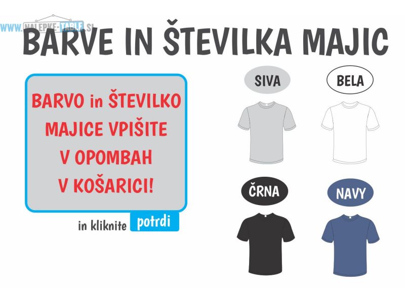 ŠTEVILKO (S,M,L,XL,XXL)  MAJICE VPIŠITE V OPOMBAH V KOŠARICI, NATO KLIKNITE GUMB POTRDI!